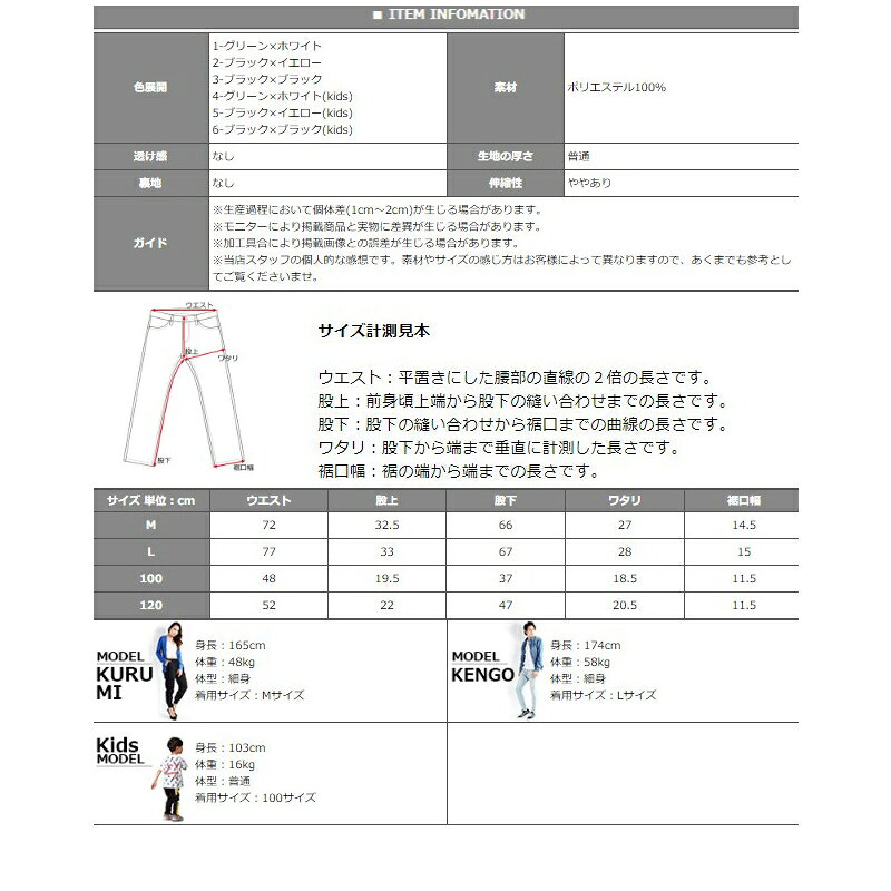 サイズ 単位:cm ウエスト 股上 股下 ワタリ 裾口幅 M 72 32.5 66 27 14.5 L 77 33 67 28 15 100 48 19.5 37 18.5 11.5 120 52 22 47 20.5 11.5 身長:165cm 体重:48kg 体型:細身 着用サイズ:Mサイズ 身長:174cm 体重:58kg 体型:細身 着用サイズ:Lサイズ 身長:103cm 体重:16kg 体型:普通 着用サイズ:100サイズ